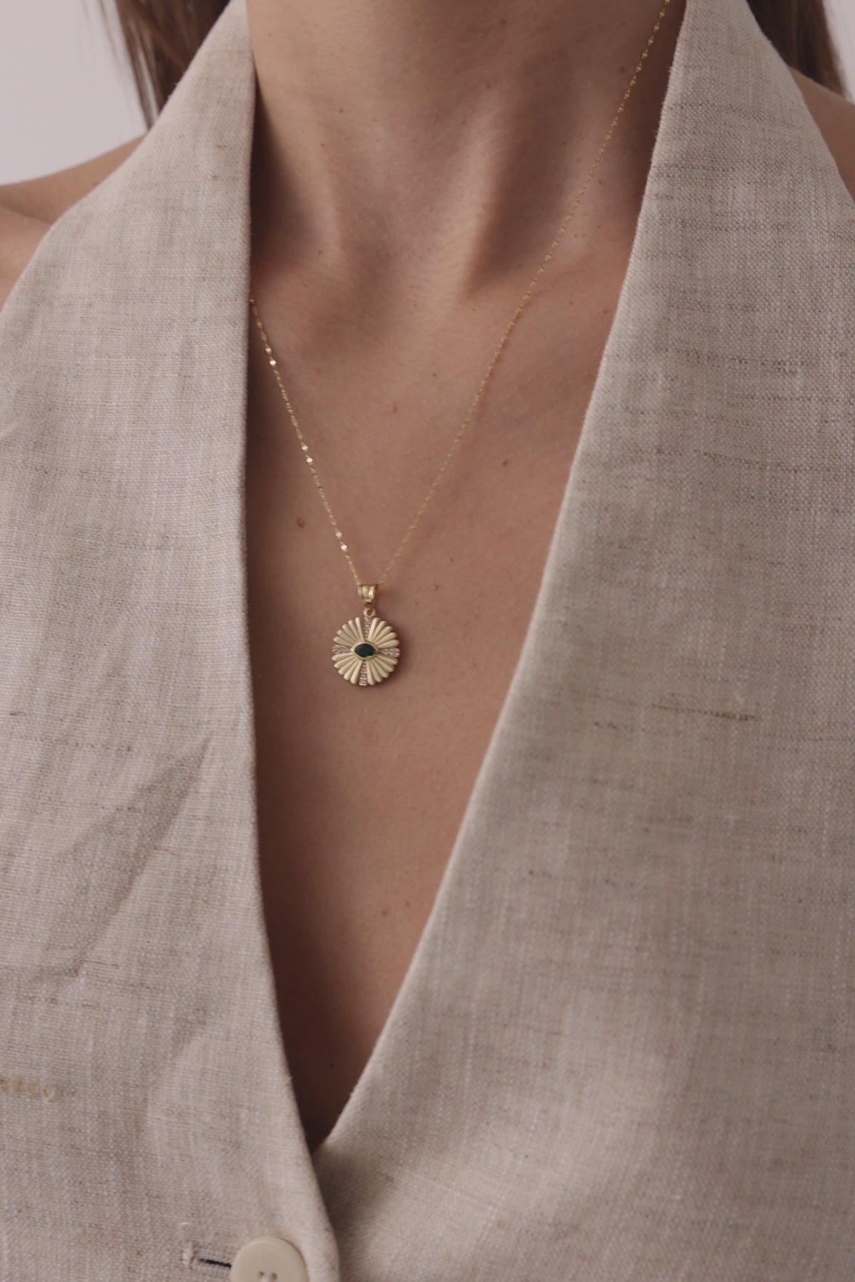 14 Ayar Altın Yeşil Taşlı Güneş Işıltılı Kolye